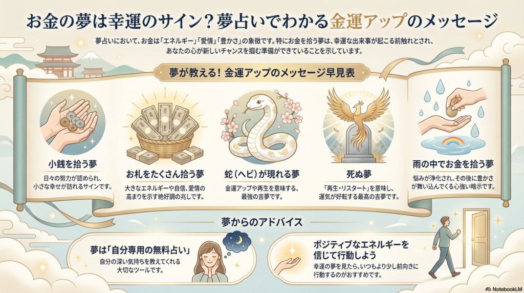 夢占いにおいて、お金は「エネルギー」「愛情」「豊かさ」の象徴です。 2026年の最新トレンドでも、お金を拾う夢は「ラッキーな出来事が起こる前兆」として非常にポジティブに捉えられています。